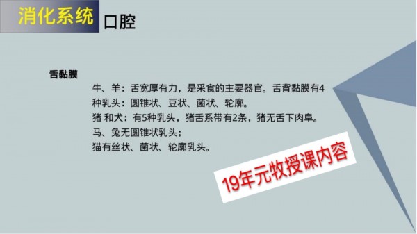 解析:90题--舌下肉阜位于舌系带前面,牛羊马的舌下肉阜都很发达,肉食动物的较小,猪的缺失。本题中没有列出肉食动物,所以只好选猪。