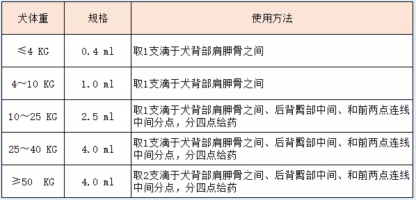 【用法与用量】仅限犬用。仅供皮肤外用。用药时犬应保持容易使用本品的姿势,分开犬毛至看到皮肤,将滴管前端抵住皮肤,适当挤出药液到皮肤上,最后用毛覆盖住用药部位。预防或治疗期间,每月使用1次,可维持至少1个月有效。按不同规格用量,详见下表: